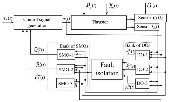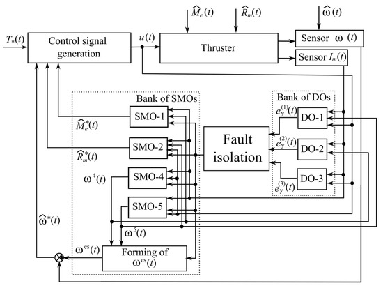 The article will be organized as follows. In Section 2.1, a mathematical model of the propulsion system is described, taking into account possible faults. Section 2.2 provides a method for creating a DO bank to isolate faults. Section 2.3 describes a method for constructing SMOs to identify the values of previously isolated faults. In Section 2.4, the construction of additional observers is described, which makes it possible to simultaneously identify the values of two faults that have occurred. In Section 2.5, a synthesis of the compensation system for previously isolated and identified faults is presented, as well as the verification of its operation using computer modeling. In Section 3, the results of an experimental study of the developed systems on a special electromechanical stand is presented. Section 4 concludes the paper.