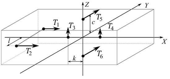 The bank of DOs (23)–(25) makes it possible to determine the fact of the appearance of non-zero functions , (or the functions and dependent on them), and caused by the occurrence of the corresponding faults in the thrusters of the UR. For this bank, the matrix of syndromes S is given by
