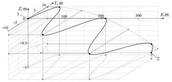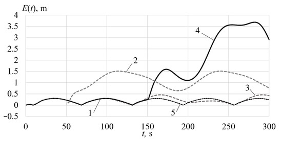 Curve 1 in Figure 7 shows the tracking error without any faults. Curve 2 shows the tracking errors when the errors and appear without compensating. In this situation, the tracking inaccuracy increases to 12.3 m (in 41.6 times). Curve 3 shows the graph of the tracking error when functions and appear. Here, the tracking error increases to 1.4 m (in 4.66 times). Curve 4 indicates the tracking error exceeds 21 m (in more than 70 times) when non-zero functions and appear. Curve 5 indicates the error when any combinations of the paired faults occur but the compensating system shown on Figure 3 is used. Obviously, this system stabilizes the tracking error at the nominal value for any set of the paired faults.