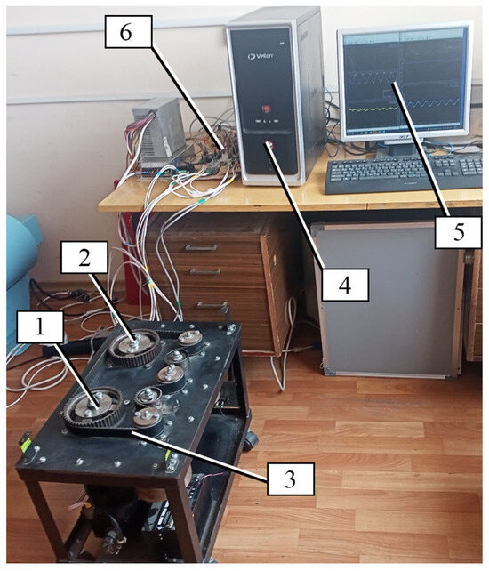 To verify the functionality of the proposed compensating system, in addition to computational simulation, a series of full-scale experiments were carried out using an electromechanical stand shown in Figure 8. It contains two DC electric motors with toothed pulleys on their output shafts (see Figure 8, numbers 1 and 2), connected by a belt drive (Figure 8, number 3). The sensors in the stand are a tachogenerator for measuring the speed of the rotation of the motor shafts and current sensors installed on both electric motors. A PC with Matlab 2021b software (Figure 8, number 4) was used to control the stand and display the appropriate information (Figure 8, number 5). The digital control of the stand was carried out using the ESP-32 microcontroller (Figure 8, number 6).
