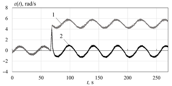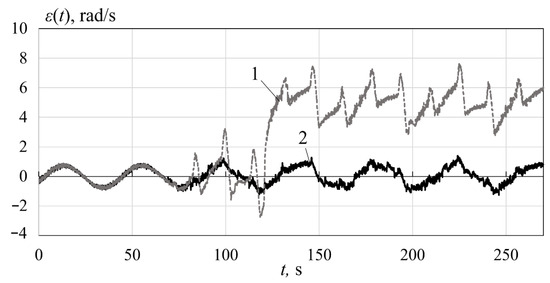As it follows from Figure 9, the appearance of the constant error increases the maximum errors from 0.8 rad/s to 5.8 rad/s, i.e., 7.25 times. However, when the compensating system is used, the error is only 1.1 rad/s, i.e., it is decreased 5.27 times.