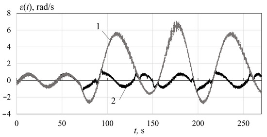 If a variable error appears in the angular velocity sensor readings (see Figure 10), the maximum error increases from 0.8 rad/s to 7.1 rad/s (8.87 times). The use of the compensating system reduces this error to 1.3 rad/s (6.82 times).