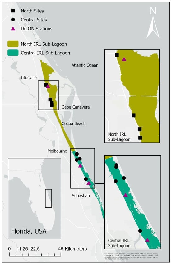 The IRL is a shallow, restricted lagoon system [25] spanning 256 km along Florida’s subtropical East coast. It is divided into five distinct sub-lagoons: North IRL (NIRL), Central IRL (CIRL), Southern IRL (SIRL), Banana River, and Mosquito Lagoon [26]. These IRL sub-lagoons differ in hydrological flow and water residence time, due to tidal influences, freshwater flows, ocean inlets, wind, and rainfall [27]. Five ocean inlets punctuate the IRL, with considerable distance between them, resulting in high water residence times (~230 days in the NIRL; [28]). This study focused on sites in the CIRL and the NIRL only (no sites were established in the SIRL, Banana River, or the Mosquito lagoon), due to resource limitations. The CIRL is located within proximity to four of these oceanic inlets, resulting in a lower water residence time and more hospitable conditions for seagrass growth. Spatial and temporal exchange of freshwater input from watersheds results in fluctuating salinity, temperature, and light availability, which drive seagrass distribution and cover [29]. Seagrass species richness increases near the southern inlets and decreases in areas with higher water residence times [30].