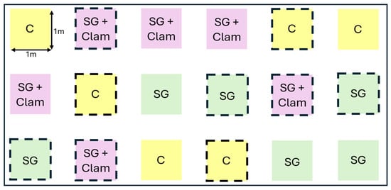 Example of a site plan includes 18 plots, plots were 1 m2 and spaced at least 0.76 m apart. The yellow square labeled “C” indicates sand only control, green square labeled “SG” indicates seagrass only restoration, and pink square labeled “SG + Clam” indicates seagrass and clam co-restoration (n = 3 for all plot types). Dashed black outline indicates plots protected from herbivory by HED (n = 9). Plot location was randomized for each site and orientation of the grid within the sites was adapted to the space available.