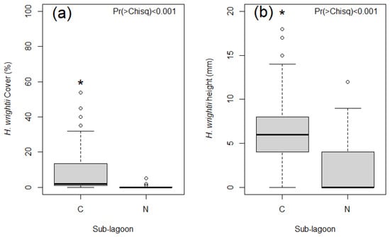 Across all sites and treatments in July 2022, (a) Halodule wrightii cover (%) was 69.18% higher in CIRL than NIRL and (b) H. wrightii canopy height (mm) was 96.75% higher in CIRL than the NIRL. North sub-lagoon (N, n = 4) and Central sub-lagoon (C, n = 5), all p < 0.001 (Table S3). Outliers denoted by open circles, significance shown as asterisk, and error bars by dashed vertical lines.