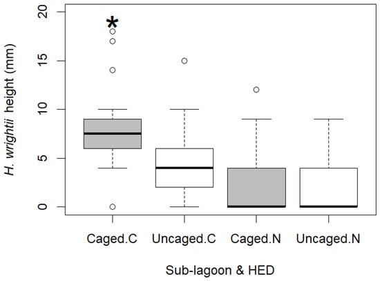 Halodule wrightii height (mm) for plots with (caged) and without (uncaged) HEDs in July 2022 (n = 5). Greater seagrass height (mm) was observed in caged plots in the central sub-lagoon (C). Outliers denoted by open circles, significance shown as asterisk, and error bars by dashed vertical lines.