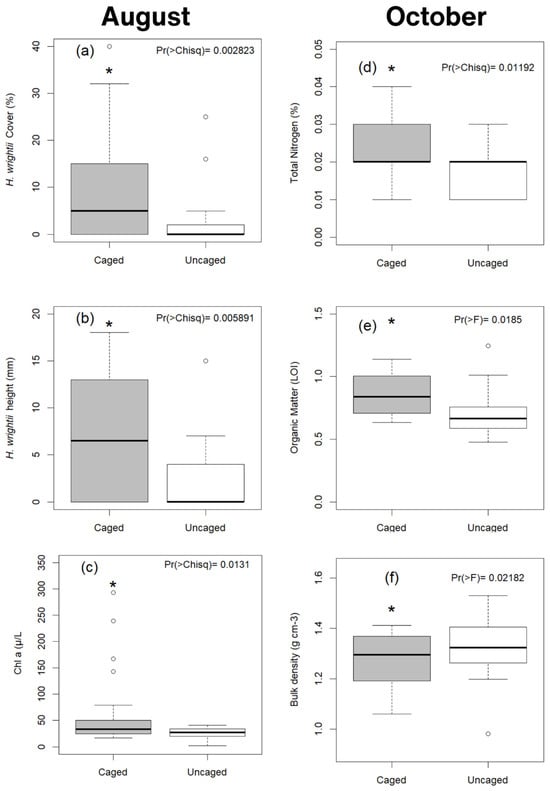 In August, no significant differences were found in TSS, POM, PIM between caged and uncaged plots, (all p > 0.05), but caged plots had greater Chl than uncaged plots (X21,27 = 6.1549, p = 0.0131, Figure 5, Table S4).