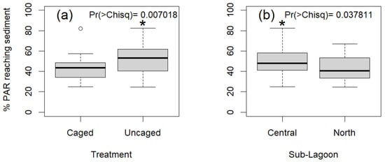 Across all sites and treatments in July 2022, (a) PAR reaching the sediment (%) was 29.7% higher in caged than uncaged plots across both sub-lagoons and (b) PAR reaching the sediment (%) was 26.3% higher in the central sub-lagoon (n = 5) than the north sub-lagoon (n = 4, all p < 0.05, Table S3). Outliers denoted by open circles, significance shown as asterisk, and error bars by dashed vertical lines.