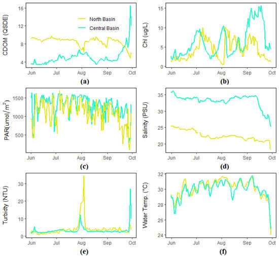 From IRLON water quality measurements, there were significant differences between sub-lagoons for CDOM (QSDE), chlorophyll (Chl; μg L−1), PAR (μmol m−2 s−1), salinity (ppt), turbidity (NTU), and water temperature (°C, Figure 7; Table S2).