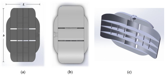 A rectangular curved slotted board is used as a research object. The prototype board comes from Haoran Li master thesis [11] In this study, the specific structural parameters of the prototype were obtained from these drawings provided by the manufacturer. Given the limited volume of the towing tank, the structural parameters of the prototype otter board were scaled down. The original prototype had a chord length of 2400 mm and a wingspan of 1459.8 mm. Its slotted structure can reduce the vortex flow and enhance its hydrodynamic performance [11,12]. Figure 1 shows the diagram of rectangular otter board model. A 1:6 scaling ratio is adopted in the process of model building. Its main dimensions are a wingspan of L = 243.3 mm, a wing chord of b = 400 mm, a slot size of d = 50 mm, an aspect ratio of λ = 0.608, and a plane area of s = 85,580 mm2. Figure 1 shows a diagram of the rectangular otter board model. Figure 2 shows different working postures of the otter board.