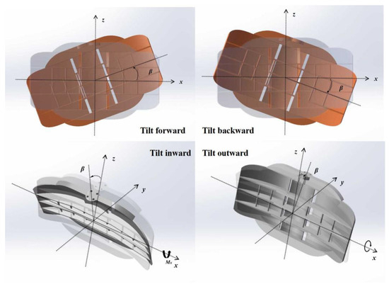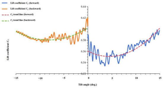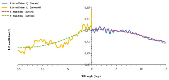 The continuous change in lift coefficient with tilt angles (inward and outward).