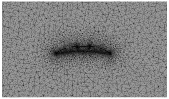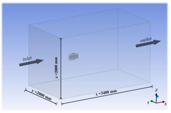 The entire flume field and board are divided by unstructured mesh. Unstructured mesh can generate a better quality of mesh for the complex boundary and structure of the rectangular board [13,14]. The length, width, and height of calculation domain were set at 3400 mm, 2000 mm, and 2000 mm as shown in Figure 3. The front of the board was 800 mm away from inlet in order to reduce the wall effect. The element size of global mesh was set to 30 mm. Two meshing functions, capture curvature and capture proximity, were carried out in this study to enhance the quality of mesh. The mesh size of the board and its approaching flow field were set to 5 mm. The number of elements and node elements totaled approximately and . Less than 1% of the mesh elements have a Skewness value exceeding 0.5, indicating that the overall mesh quality is relatively high. Figure 4 shows the detail of mesh division.