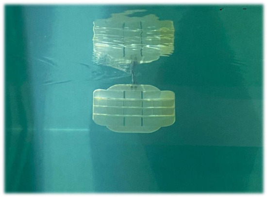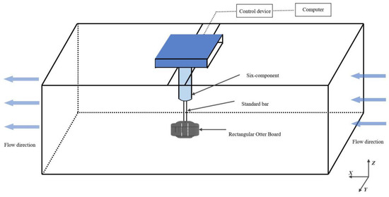 To validate the dynamic model results, a board model of the same size was tested in a flume tank. Figure 5 shows the rectangular otter board model test design schematic diagram. The experiment usually requires two researchers to operate due to the complexity of the equipment. When testing one of the fixed AOA of the board, one researcher needs to adjust the AOA and wait for data of the six component force sensors to become stable, and another staff can operate the computer to start recording data. If one is using a flume tank to obtain continuous data of the board, two researchers are required to operate it at the same time. There may exist a time difference causing human error in the results. The collected data are the average force of the board in the stable state of AOA for about 30 s. If using a flume tank to make the board continuously rotate, the six component force sensors will keep being in the unstable state. Therefore, this study considers that it is not reasonable to obtain continuous data from the flume tank. However, to indirectly prove the results of the dynamic model, this study tries to compare the data from dynamic model and flume tank under the same AOA. That means we try to compare the results of the dynamic model at a certain time with flume tank. Both results are in the same AOA. The AOA interval in the flume tank test is generally 10°. In order to further improve the validity of the indirect verification, the interval in this study was reduced from 10° to 1°. This experiment was carried out in Shanghai Ocean University, using six component force sensors to measure the board force, and the minimum measurement of the six components’ force sensor angle is 1° [24]. Figure 6 shows the process of rectangular otter board model test.