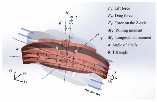 V is flow rate (), b is the wing chord of the board (m), c is the wing span of the board (m), ρ is fluid density , μ is dynamic viscosity of the fluid ), FL is lift force (N), FD is drag force (N), Fz is the force of Z axis, S is the projected area of the board (m2), Mx is the rolling moment, Mz is the longitudinal moment, db is the distance from the wing span to the pressure center (m), dc is the distance from the wing chord to the pressure center (m), α is the angle of attack, and β is the tilt angle.