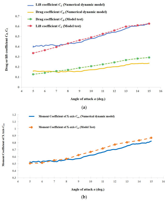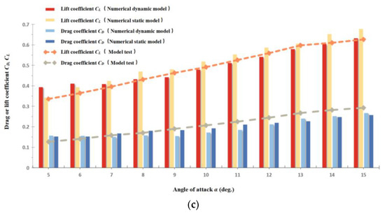 Comparison of (a) lift coefficient and (b) moment coefficient between numerical dynamic model and model test. (c) Comparison of drag or lift coefficient of numerical dynamic model, numerical static model and model test.