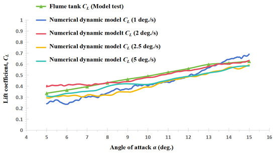 The comparative results are shown in Figure 8. Figure 8a shows that the matching condition of the lift coefficient is better under the large AOA, with a relative deviation range of 0.27% to 17.26%. However, two sets of drag coefficient match better under a small AOA, with a relative deviation range of 5.35% to 23.77%. The simulation data calculated from dynamic model shows that the maximum lift-to-drag ratio is approximately 2.68, achieved at an AOA = 12°. This study also includes a comparison of Cmx; the specific results can be seen in Figure 8b. Based on empirical values, a difference of within 30% between numerical simulation results and model test outcomes is considered a reasonable margin of error. In this experiment, the maximum error was 23.77%, indicating that the error falls within the acceptable range. Figure 8c shows the comparison of lift coefficient of the dynamic model, static model, and model test at a specific AOA. As shown in Figure 8c, the drag coefficient increases gradually with the angle of attack. It may be because as the AOA increases, the contact area between the otter board and the water flow expands, resulting in greater resistance to the flow.