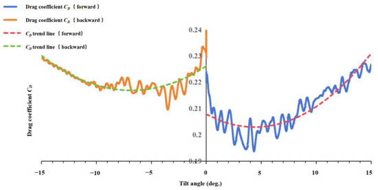 The continuous change in drag coefficient with tilt angle (forward and backward).