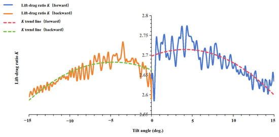 The continuous change in lift-to-drag ratio with tilt angles (forward and backward).