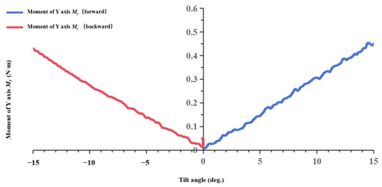 The My represents the moment of the lateral resultant force, and a larger value indicates a greater restorative moment required for the board to maintain its lateral dynamic stability. As shown in Figure 15, for both forward and backward leaning of the board, the lateral resultant moment exhibits a maximum value at a 15° tilt angle.