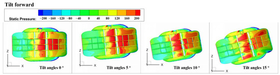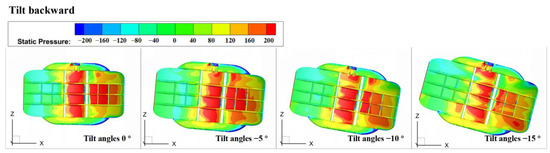 Figure 16 and Figure 17 illustrate the surface pressure distribution of the rectangular board under forward or backward angles. The red regions represent high-pressure areas where the surface pressure exceeds 200 Pa, while the blue regions represent low-pressure areas. These figures show that at a zero-degree inclination, the surface pressure on the otter board differs between forward and backward tilting. The red area at the center of the board is significantly larger during forward tilting than in backward tilting. This is likely due to the use of hybrid initialization, similar to the cause of the discontinuity observed in Figure 10, Figure 11, Figure 12, Figure 13, Figure 14 and Figure 15 and will not be explained in detail here. As shown in Figure 16, during forward leaning, the area of the central red high-pressure region gradually decreases, while the red high-pressure regions in the upper-wing chord direction and the front-wing span direction relatively increases. As depicted in Figure 17, when the board tilts backward, the red area at the lower right part of board increases with the increase in tilt angles. The above results are consistent with the results in Figure 13 and Figure 14.