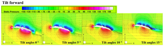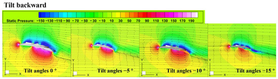 Figure 18 and Figure 19 show the flow field distribution around the board under tilting forward or backward angles. During forward-leaning, the front of the board first encounters the water flow, resulting in a red high-pressure area in the front section of the board. As the water flow impacts the upstream surface of the board after passing the front end, there is also a red high-pressure area in the middle section of the board. With the increase in the tilt angles, the red high-pressure area slightly decreases. The flow field distribution further confirms the change trend in the drag force during the forward tilt process. As the forward-leaning angle increases, the red area on the upstream surface moves to the forward direction, indicating that the pressure center, Cpb, moves closer to the left-wingspan. As the backward-leaning angle increases, the red high-pressure area in the middle of the board gradually decreases.