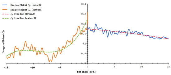 The continuous change in drag coefficient with tilt angles (inward and outward).