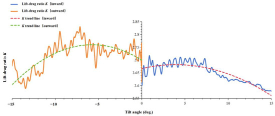 The continuous change in the lift-to-drag ratio with tilt angles (inward and outward).