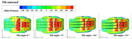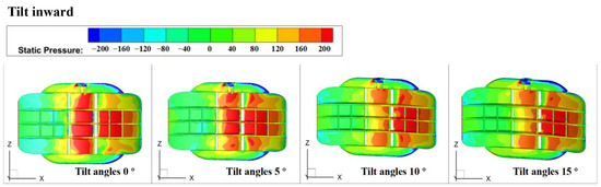 In Figure 10, Figure 11, Figure 12, Figure 13, Figure 14 and Figure 15, it can be seen that the results for forward and backward tilting at a 0° are not the same, leading to discontinuity at this angle. One possible reason for this outcome is that Fluent employed hybrid initialization to the numerical calculations, resulting in inconsistencies in the initial pressure and velocity fields. Fluent offers two types of initializations: standard initialization and hybrid initialization. Standard initialization allows users to define the initial physical field, which can lead to uniform initial values across the entire field. For instance, if the initial pressure is set to 200 Pa, the entire flow field will also have a pressure of 200 Pa, which clearly does not reflect real-world conditions. Hybrid initialization is a method used prior to numerical simulations that performs a few iterations to generate initial velocity and pressure fields, avoiding the unrealistic uniformity of preset initial values. Its advantage lies in accelerating the convergence of the simulation, especially for the pressure and velocity fields. However, its drawback is that the initial results may be inconsistent, potentially causing discontinuities in the early iterations. As the iterations continue, Fluent gradually converges to the true values, but discrepancies may still arise during the initial steps of the calculation.