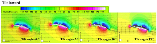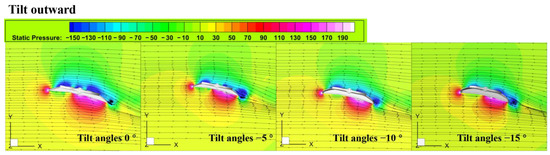 Figure 27 and Figure 28 show that the flow field distribution of board in inward- and outward-leaning states. From the above photographs, we can find that the blue low-pressure area of the inward-leaning board is more obvious than outward-leaning board. The reason for the origin of lift force of the board is the pressure difference between the upper and lower surface of board according to Bernoulli’s principle. It is obvious that the pressure difference in the inward-leaning board is larger than the outward board, which means that the lift force coefficient of the inward-leaning board is greater than outward-leaning board. We can also obtain the same conclusion from Figure 20.