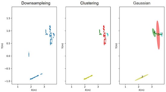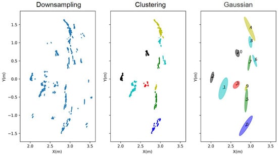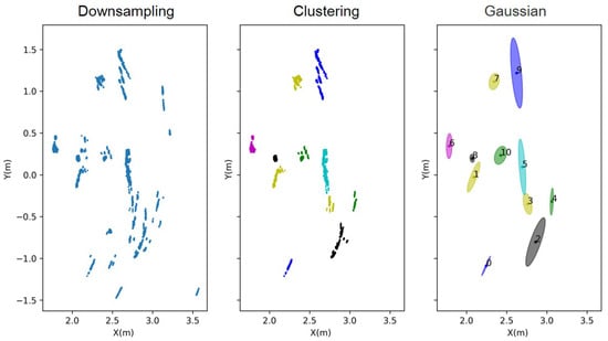 After downsampling the feature point cloud, clustering is performed using DBSCAN. When the search radius and the minimum number of points in a cluster , the results are depicted in Figure 2. After clustering, we filter the clusters based on the number of point clouds they contain to eliminate discrete noise points. Clusters with several point clouds greater than are retained for subsequent Gaussian generation. Here, represents the threshold for the number of point clouds. Next, a Gaussian block is generated for each cluster by traversing the clusters’ labels. Gaussian blocks are used to characterize the shape of each cluster, and the parameters of the Gaussian are defined as follows: