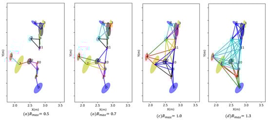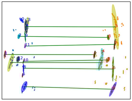 We employ the recursive Bron–Kerbosch algorithm [30] to identify maximal cliques. Our experiments reveal that a clique with three nodes yields the most stable cluster structure. When the number of nodes in a maximal clique is too small, such as two, the clique is insufficient to adequately describe the adjacency relationships among Gaussian blocks, leading to potential similarities that cannot be effectively distinguished. Conversely, identifying maximal cliques may become difficult when the number of nodes reaches four. This is attributed to the disappearance of some obstacles from the robot’s field of view during its movement, making it unsuitable for environments with sparse features. We seek a stable structure to address this issue by targeting a maximal clique with exactly three nodes. Figure 4 illustrates a schematic of the identified maximal clique.