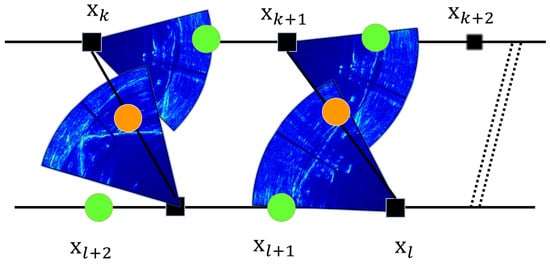 Let represent the state of the robot at the i-th timestamp, where . The robot state , where represents the direction of the robot at the i-th timestamp and represents its position [35]. To embed the environmental map into the state space, we depict an entity, such as a point cloud or salient image features, as a two-dimensional point feature. This feature is designated as , where . Then, the measurement result can be represented by , where , and the landmark observed in the state of during the measurement process usually corresponds to a set of paired associations .