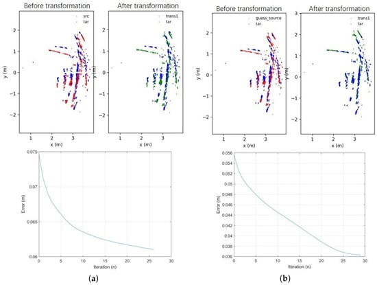 After acquiring the descriptors of the two images and [31], the GM algorithm is employed for descriptor registration. Figure 10 illustrates the matching outcome between the source and target point cloud of the fifth frame, demonstrating high accuracy. This high accuracy is a result of the robust Gaussian block representation and the effective descriptor-matching strategy employed by our GM algorithm. The Gaussian blocks are effectively aligned, providing initial points for calculating the predicted transformation matrix . The dense point cloud and the expected matrix are then substituted into the ICP for resolution. Figure 11a indicates that the traditional ICP algorithm encounters convergence issues by the 26th iteration, settling into a local minimum with a final error of 0.0623 m. This error is specifically related to the registration accuracy between the two point clouds. Figure 11b displays the result after ICP iterations, where the point clouds are nearly superimposed with an error of 0.036 m, achieving convergence around the 29th iteration. This suggests that the enhanced algorithm effectively addresses the issue of ICP getting stuck in local optima and failing to converge, thereby strengthening the system’s pose estimation accuracy.