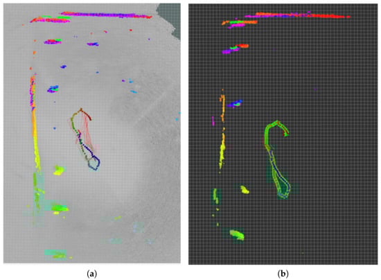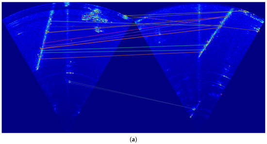 In a monotonous environment with sparse sonar target features, the quality of adjacency relationship information is compromised, resulting in the generation of descriptor information that is not viable for use, as illustrated in Figure 12. This, consequently, causes the failure of the ICP solution. Moreover, the direct application of the ICP algorithm is typically ineffective in linear environments. Therefore, we employ the AKAZE algorithm to extract features from long, straight-line segments. As depicted in Figure 13b, target point clouds and registered source point clouds are nearly superimposed, indicating successful feature matching. Consequently, employing a frame-by-frame matching approach that leverages both the AKAZE and GM algorithms in tandem effectively addresses sonar feature matching. This method is adept at handling scenarios involving rotation and long, straight lines, facilitating the precise estimation of the robot’s motion state. The complementary nature of these algorithms compensates for the limitations inherent in each.