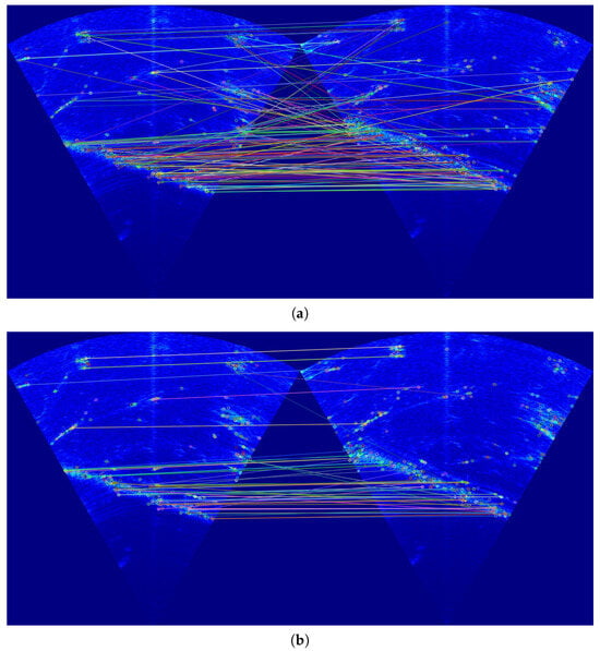 Figure 14 presents a comparative analysis of the traditional versus the improved culling method at the 37th frame. The prevalent engineering approach for eliminating incorrect matches is two times the Hamming distance method, typically utilized in terrestrial visual matching. However, underwater sonar imagery is subject to multipath echoes and higher noise levels, which render this method less effective, as shown in Figure 14a. Building upon this, our approach further refines the elimination of mismatches induced by echoes, thereby enhancing the registration precision, as shown in Figure 14b. The improved method is observed to effectively eliminate mismatches due to sonar echo characteristics, leading to a marked enhancement in registration accuracy and robustness.