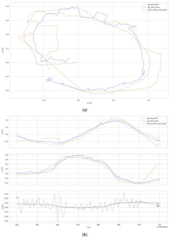 Figure 16a presents a comparison between the predicted trajectory generated by GM SLAM, the trajectory produced by the existing Bruce SLAM algorithm, and the actual trajectory obtained from motion capture data. Utilizing the evo tool [39], the trajectories were aligned for a thorough analysis. The analysis reveals that GM SLAM experiences fewer frame-matching failures and exhibits superior robustness in complex environments. Bruce SLAM, however, shows more drift, indicating feature tracking issues and a higher rate of incorrect frame matches, which underscores the higher positioning accuracy of GM SLAM. Figure 16b presents an error analysis for the x, y, and z axes. The operational height of the robot is set at approximately 0.58 m, and the motion capture system boasts a measurement accuracy of 0.02 m. Given the assumption of horizontal plane movement, maintaining the robot at a consistent depth is challenging, resulting in deviations along the z-axis. These deviations, in turn, impact the accuracy of the x and y directions in SLAM.