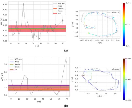 The Absolute Pose Error (APE) calculation results are detailed in Table 2, with Figure 17 illustrating the corresponding results for the estimated motion trajectories compared to the true values. Figure 17a illustrates that the main robot errors in GM SLAM occur during turning sections, which require further improvement. By comparing the trajectory errors of the three, it can be seen that the average error (mean) of the predicted trajectory of GM SLAM compared to the true trajectory is 0.118 m, with a root mean square error (rmse) of 0.132 m. In contrast, as shown in Figure 17b, the average error (mean) of the trajectory predicted by the Bruce SLAM algorithm is 0.189 m, with a root mean square error (rmse) of 0.247 m, both of which are greater than the errors of GM SLAM, indicating that the positioning accuracy of the GM SLAM algorithm is superior to that of the Bruce SLAM algorithm. Moreover, the standard deviation (std) of the trajectory of GM SLAM is 0.059 m, while that of the Bruce SLAM algorithm is 0.159 m. The other error items of GM SLAM are also generally smaller than those of Bruce SLAM, further demonstrating that the GM SLAM positioning algorithm has higher robustness and is superior to the Bruce SLAM algorithm.