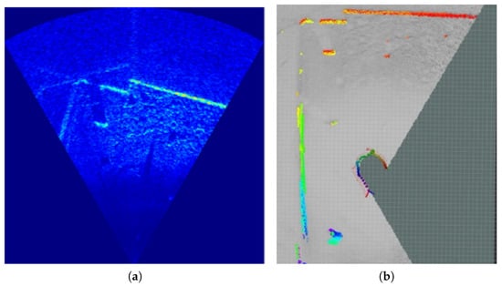 We employ the BlueRov2 robot as the primary motion carrier, integrating the Oculus M1200d multibeam sonar, the DVL-a50 Doppler Velocity Log, and an IMU into its hardware suite, as shown in Figure 7a. Communication is enabled through a mini switch and a Raspberry Pi, with signals relayed to a distant PC via a carrier module. The multibeam sonar functions in a high-frequency mode at 2.1 MHz, offering a maximum field of view of 10 m, a horizontal aperture of 80°, a vertical aperture of 12°, and a maximum update frequency of 40 Hz. It boasts a range resolution of 0.007 m and an angular resolution of 0.4°. These sensor characteristics are detailed in Table 1. Sensor data are aggregated for seamless communication using the Robot Operating System (ROS). This enables the visualization of sonar raw data and image data, as well as the DVL data visualization module, as shown in Figure 7b. This setup is crucial for subsequent validation with the SLAM system.