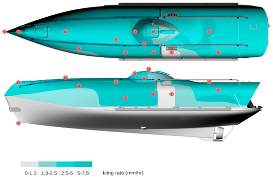 The windspeed and air temperature were measured with Aanderaa weather stations mounted on the lifeboat and a support vessel. The wave height and periods were measured with an Aanderaa wave height sensor mounted on a custom-made buoy. The water temperature was measured with a thermometer. At the end of the test, the ice thickness was measured with a Tritex Multiguage 5650-SG ultrasound gauge and visual observations around level pins pasted at multiple points on the surface [12]. The ultrasound thickness measurements were limited to the areas with clear ice due to air bubbles. The resulting distribution of icing on the lifeboat is classified into icing rates ranging from 0–7.5 mm/h as shown in Figure 2.