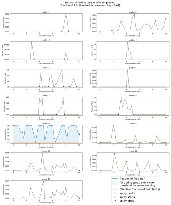 Figure 3 shows the variation of the fraction of fluid at each probe. The highlighted regions show the spray events in which the fraction of fluid reaches over the threshold for wave washing. Except the control probe (probe 9), none of the other probes showed a fraction of fluid above the assumed threshold for wave washing. Since the maximum fraction of fluid at other probes is always less than the wave-washing threshold, all the fluid entering these cells counts towards the effective volume of fluid causing icing.