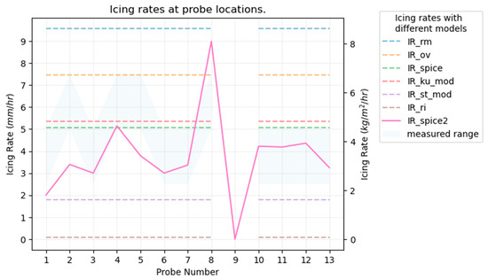 Table 2 shows the exact values of the predicted icing rates with SPICE2, comparing them with the measured range of the icing rates (exact measurements of the icing rates are confidential data and only the presented range was made available for this study), and shows the deviation of the predicted icing rates to that of the measured range. As already shown in Figure 3, only four probes (1, 2, 5, and 8) give icing-rate values outside the measured range. It can be seen that, for these probes, the maximum deviation is less than 1.6 mm/h, which is in fact less that the range of measurements.
