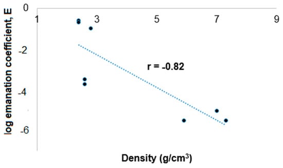 Table 4 shows the E data determined from the results reported in Table 1 and Table 3, with a range of 3.18 × 10−6 to 0.59, agreeing with most of the other findings reported in the literature that indicate that E is almost always less than 0.5 and usually less than 0.3 [24]. Figure 1 plots an inverse, significant relationship between the radon emanation coefficient (mean value for the limestone, sandstone, and schist samples) and the density of the rocks utilized in our experiments (Pearson correlation coefficient r = −0.82). This relationship suggests that the absence or an incipient amount of cracks, pores, voids, and other microstructures in the crystalline lattices of denser minerals make radon release into the fluid phase difficult, contrarily to limestones and sandstones that generally are well known as very porous sedimentary rocks.