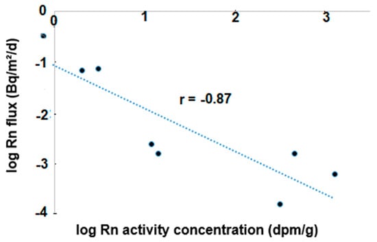 Another highlight of this investigation is the inverse, significant relationship between the radon flux data reported in Table 3 and the radon activity concentration of the rocks and minerals utilized in the emanation experiments (Table 1), as shown in Figure 2. These parameters defined the following straight line: log (FRn) = −0.848 × log (ACRn) − 1.073 (Pearson correlation coefficient r = −0.87). FRn is the radon flux (in Bq/m2/d) into the water phase, while ACRn is the radon activity concentration (in dpm/g) of the rocks and minerals, i.e., the radon produced in them. This equation allowed us to calculate FRn values from ACRn data, which could be easily obtained without sophisticated instrumentation and experimental protocols. The FRn values provided reliable estimates of the diffusive radon flux from the sediments, FDiff in Equation (1), utilizing available ACRn data for coastal and inland Brazilian areas (Table 5).