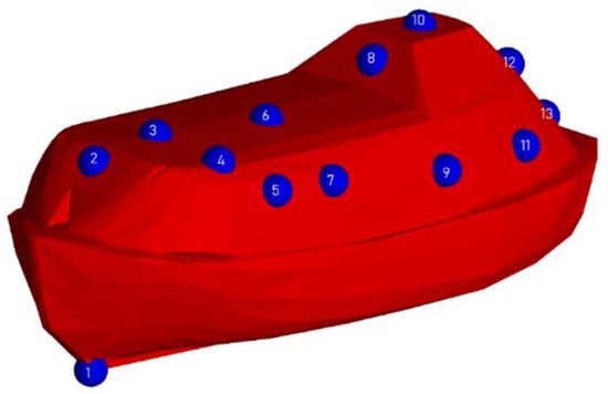 A total of 13 probes are set up on the surface of the lifeboat as shown in Figure 1. Probe 2 is located at the front hatch. Probes 3 and 6 are located on the ‘deck’. Probe 4 is located near the top hatch. Probes 5, 7, 9, and 11 are located at the port, with probes 7 and 9 near the doors. Probe 8 is located on the pilot window, probe 10 on the topmost part of the superstructure. Probes 12 and 13 are at the aft, while probe 12 lies on the aft hatch. Probe 1 is a control probe placed under the waterline at the bow to check the functioning of the codes. The current study assumes symmetrical distribution of icing, and thus probes are not placed at the starboard. The General Moving Objects (GMO) model, which enables rigid body motions dynamically coupled with the fluid, as well as prescribed motions [18], is activated, and the probes are rigidly attached to the lifeboat.