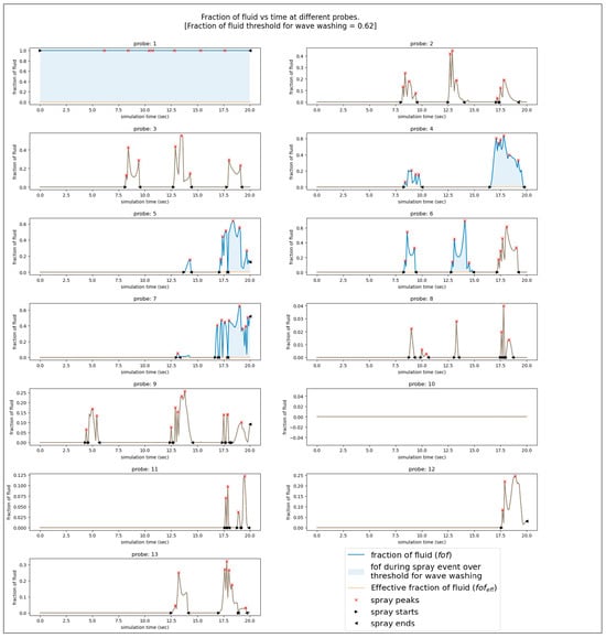 The instantaneous fraction of fluid at the probes is also used to compute the spray duration and spray period. If the fraction of fluid is 0, there is no water present in the cell; if the fraction of fluid is 1, the cell is completely filled with water. Alternatively, any value for the fraction of fluid between 0 and 1 represents a cell partially filled with water. The signal processing module in python, scipy.signal, is first used to find ‘peaks’ in the spray. A prominence threshold of 0.05 was used to find peaks in the fof values. This value can be adjusted as necessary, looking at the plots (see Figure 2). Next, the start times of sprays were found with a reverse loop starting from the peak to the time when the fof becomes zero before the peak. Similarly, the end times were found with a forward loop when fof becomes zero after the peak. The presence of multiple peaks in the same spray event gives single spray start and end times. If the start or end times are not found in the entire loop, these are set to the start and the end times of the simulation, respectively. The number of spray events (N) are thus the number of spray starts or the number of spray ends. Unlike traditional spray period and spray duration formulations, it was seen that these values are dependent on the location on the lifeboat. This would be the case in reality, where various locations would receive impinging water for different amounts of time, and some wave impacts would result in no spray at a particular location. The spray period and spray duration are calculated with Equation (8) and Equation (9), respectively, using the means of individual events. Spray period and spray duration are traditionally used to calculate the spray; however, the Spice model uses these as independent variables which have a rather small effect on the icing rate [7]. In the case of a single spray event at a probe, the spray period is set to the maximum value for spray period at other probe locations.