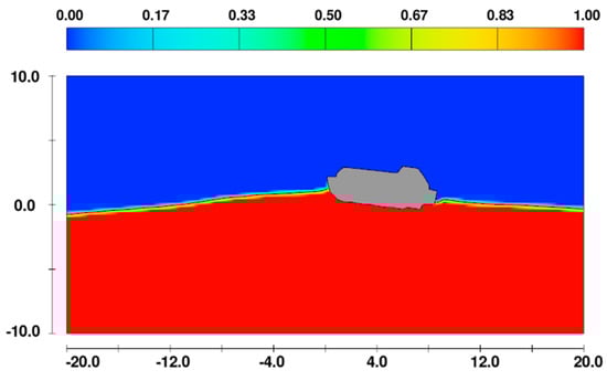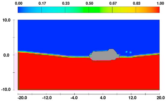Zakrzewski, 1986, mentions that the spray is caused due to the ship–wave impact [20]. While this is true, slamming that occurs after the vessel passes the wave crest is observed to produce more spray [21,22]. In the case of smaller and lighter vessels in relatively mild conditions such as in this case study, the vessel is entirely lifted with the wave and no ‘impact’ occurs. However, the slamming that takes place after the passage of the wave crest could cause some amount of spray. This can be seen in Figure 3 and Figure 4, which show the fraction of fluid in the domain before and after passing a wave crest. When the lifeboat passes a wave crest, some fluid can be seen on and around the structure of the lifeboat.