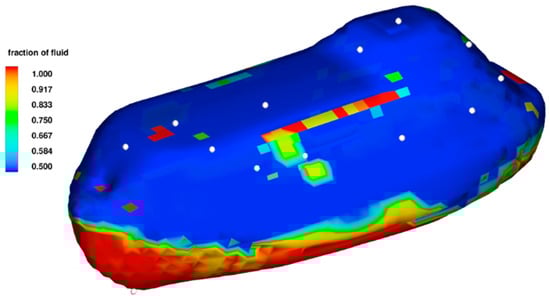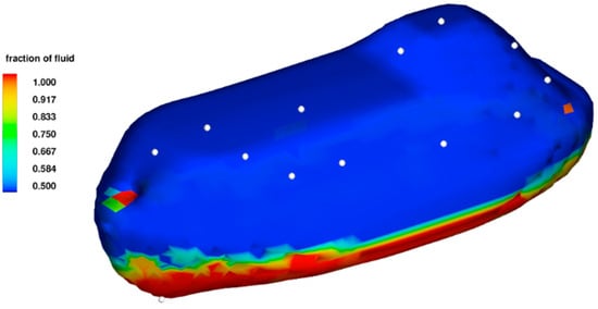 Figure 5 and Figure 6 show the distribution of the fraction of fluid on the lifeboat before and after passing a wave crest, respectively. Where there is almost no visible fluid above the waterline before passage of the wave crest, it can be observed that fluid is dispersed over parts of the structure after the passage of the wave crest.