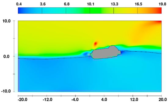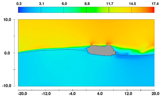 Figure 7 and Figure 8 show the velocity field before and after passing a wave crest. Firstly, the current being equal to the ship speed and the wind profile given by Equation (4) can be observed to have been successfully implemented in the simulation. After the passage of the wave crest, when the lifeboat marginally slams into the water, a region with high velocity can be observed near the bow in Figure 8.