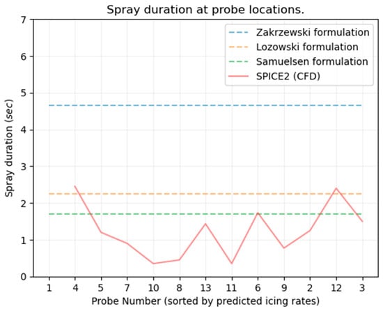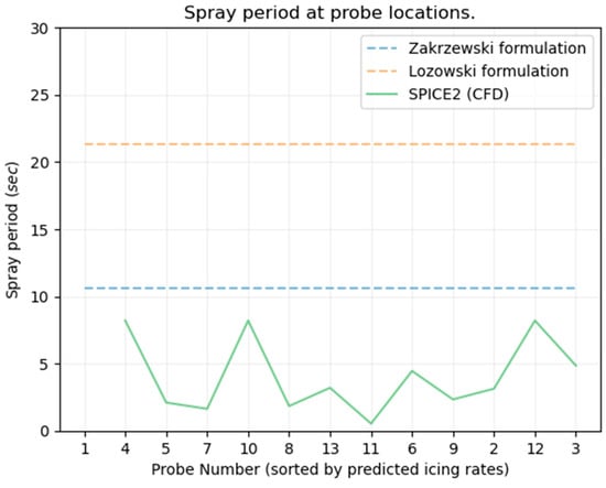 Figure 9 shows that the average spray period at each probe varies and is less than what is estimated with both existing spray period formulations. The Zakrzewski formulation considers every second wave impact to result in spray, and the Lozowski formulation considers every fourth wave impact to result in spray. They do not consider the location of measurement, which results from the CFD simulation show to affect the spray period. More details about these existing formulations, including their equations, and how they have been implemented or simplified in Spice for the purpose of comparison, along with their original references, can be found in Deshpande, 2024 [7].
