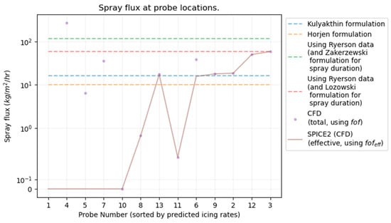 A limitation of using a coupled wind–wave domain in CFD simulations is that the directions of wind and wave propagation need to be the same. A case where wind is at an angle to the waves is difficult to simulate. The model makes some approximations for wave washing with previous spray measurement. The Spice model was not trained on ablation, melting, or wave washing [7]. Additionally, minor traces of water left after a relatively large spray, or a part of the spray after a majority of the water had impinged on the surface could indeed result in icing. Thus, even though probes 4, 5, and 7 show no icing by the current assumption of the wave washing threshold, some icing could be possible in those regions. Future studies should be directed towards the simplification of the CFD method used in this study, such that a much finer mesh could be used without requiring days for the simulation to run. Specifically for models similar to or successors to Spice2, future research could be aimed at experimenting with melting, and wave washing of accreted ice. Calculation at every cell instead of a limited number of probe locations would make ice load calculations more accurate and easier for visualization of ice accretion.
